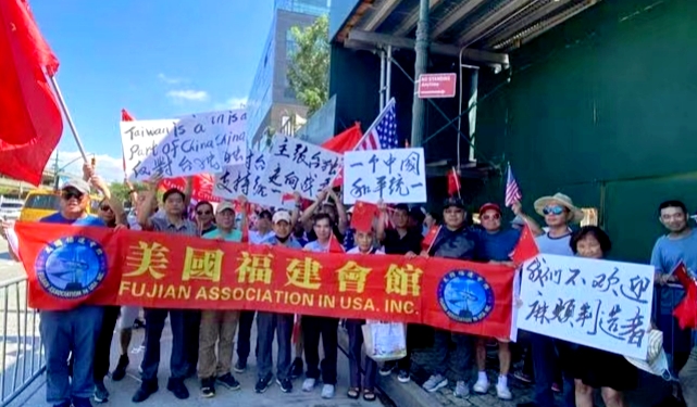 美东侨界13日除了在世界日报、星岛日报、侨报等媒体发布严正声明,强烈抗议赖清德窜访美国,并动员广大华人华侨举着中国国旗及美国国旗,至赖清德参与的宴会酒店Glasshouse前抗议,高举反“台独”、支持一个中国、和平统一及反“台独”分子「窜访」美国等标语。高喊反“台独”,反“台独”分子赖清德窜访美国,“赖清德滚出去”、“台湾是中国不可分割的一部分”。