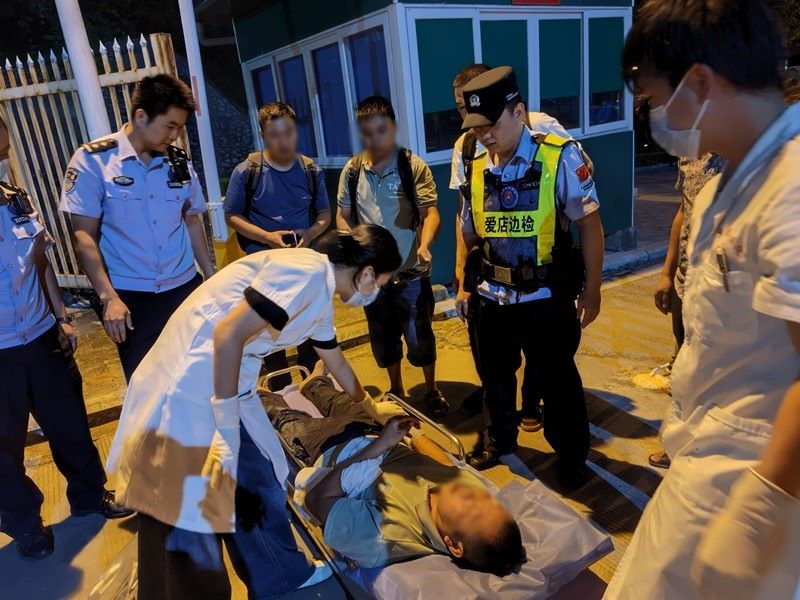 在国门线上,救护车和医护人员严阵以待,做好了随时接应的准备。当受伤同胞在爱店边检站工作人员协助下通过通道抵达我方一侧时,守候多时的医护人员立刻上前,将其稳妥转移至救护车上。在车内有限的空间里,医护人员争分夺秒,迅速为伤者进行了必要的生命体征监测、伤口初步处理、建立静脉通路等紧急医疗处置,以稳定其伤情,为后续救治争取宝贵时间。