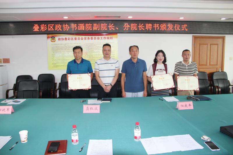 龚红波宣读了精减后的区政协书画院机构及人员调整文件,与阳庆平一起为杨城伟、刘艳等区政协书画院副院长、分院长颁发聘书。