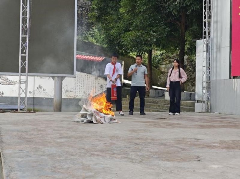 在消防知识讲座环节,杨灵老师进行了灭火器操作演示,李吉副校长详细介绍了灭火器的结构、使用步骤和适用范围,并邀请学生代表进行模拟操作,确保每位学生都能掌握灭火器的使用方法,做到“人人会用、遇火不慌”。演练中还设置了模拟火点,指导学生观察火情、学习初期火灾扑救方法。在确保安全的前提下,让学生直观了解火灾的发展过程,增强感性认识。