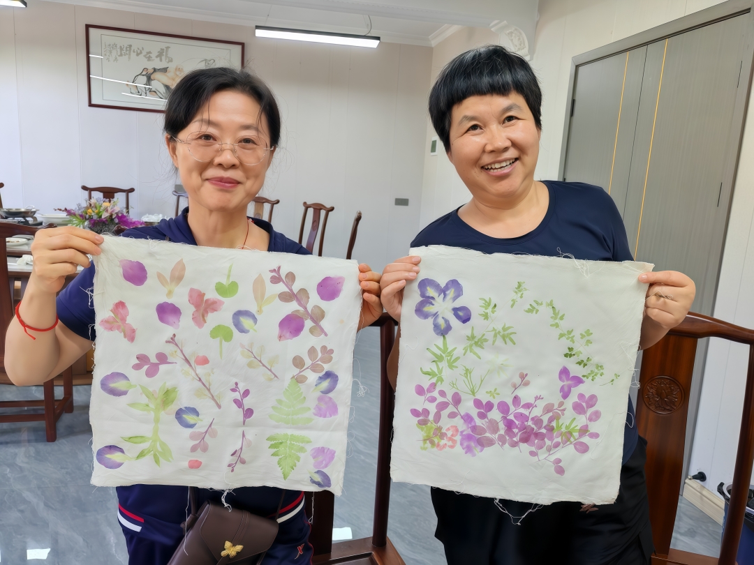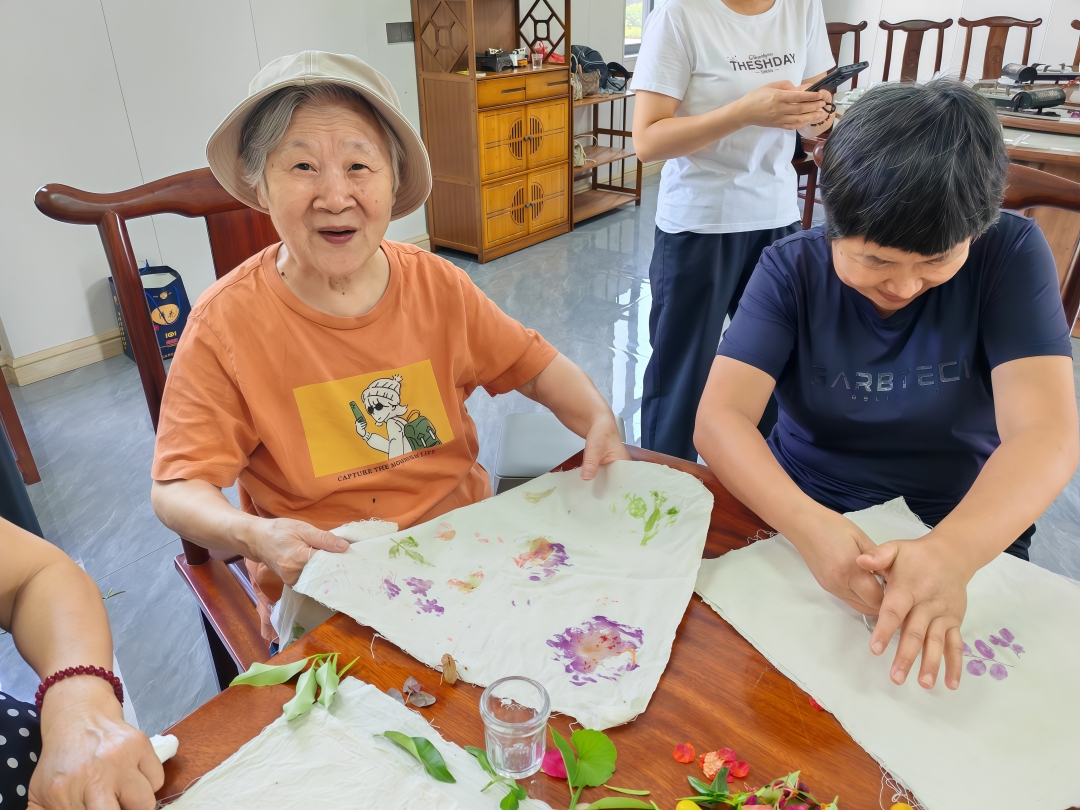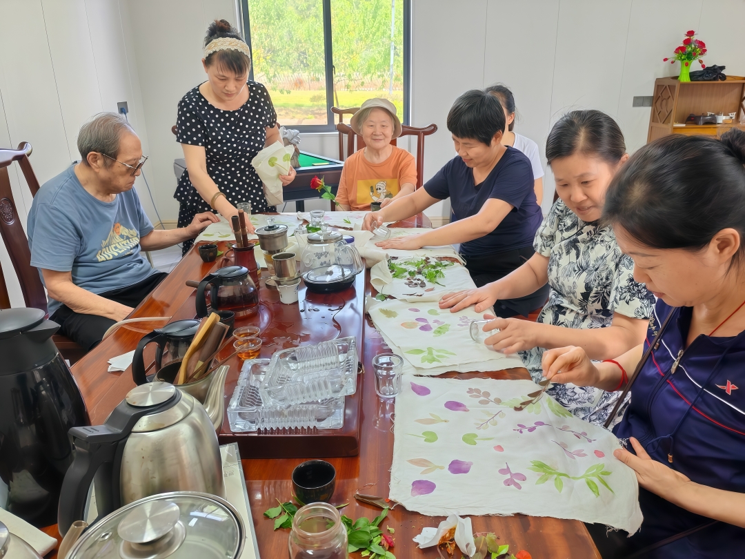 活动序幕由充满自然意趣的“植物拓染”环节拉开。参与者漫步园区,采摘形态各异、色彩缤纷的花卉与叶片,将其精心夹于两层白布之间,再用杯底耐心敲击,植物的天然汁液与脉络悄然渗透,幻化成一幅幅独一无二、灵动自然的艺术作品。看着自己亲手创作的“杰作”,大家脸上洋溢着收获的喜悦与创作的满足感。