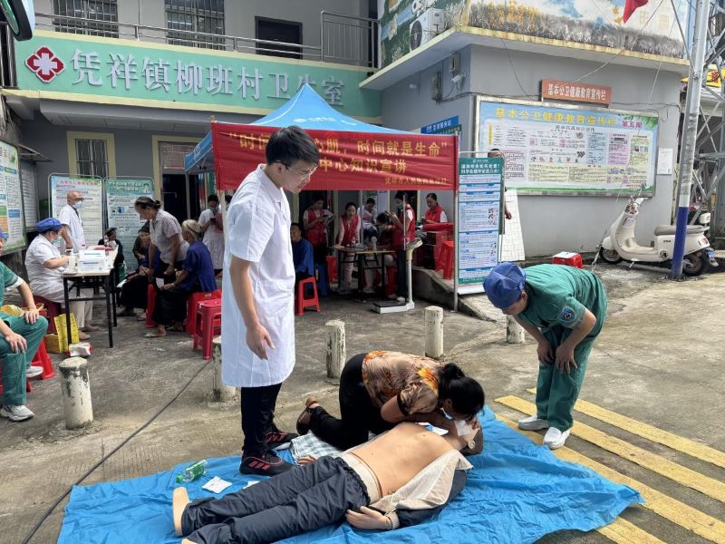 9月17日,门急诊党支部联合内科党支部的党员专家走进凭祥镇柳班村,开展“急救知识护万家”主题宣传,同步普及国家基本公共卫生服务政策。活动现场,急诊科医护人员为村民演示并进行心肺复苏术实操练习教学,还针对乡镇犬伤较多的特点,现场指导动物致伤后的规范处置流程等应急处置;内科一病区医护人员则结合常见的慢性病管理案例,向村民们讲解了高压氧治疗和胃肠镜检查的适应症及注意事项。村民黄大叔表示:“医生手把手教我们这些实用技术,以后遇到突发情况心里就有底了。”