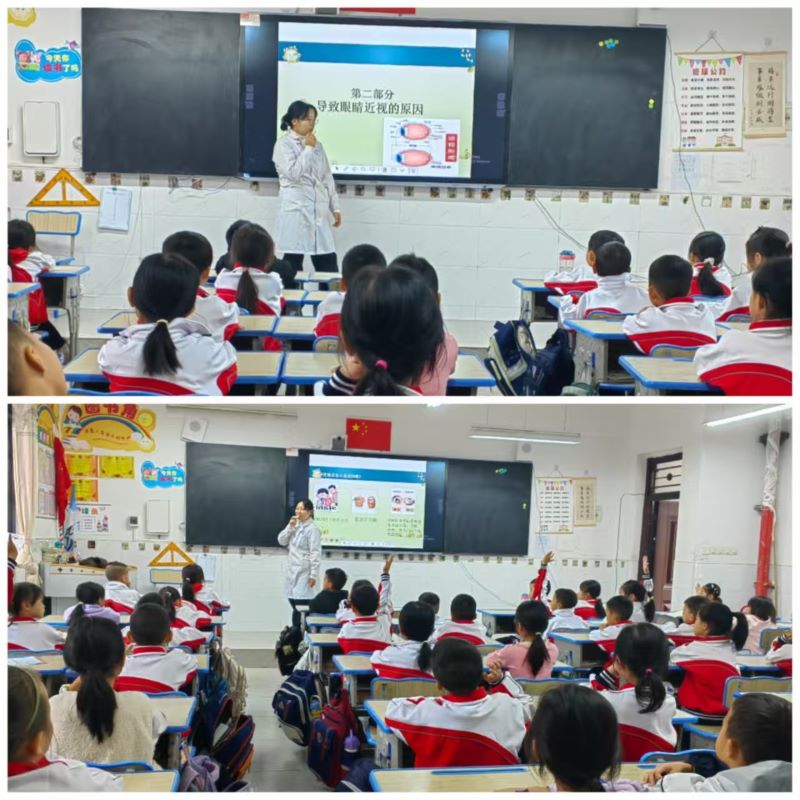 在一(2)班教室,眼科医务人员以“认识我们的眼睛朋友”为起点,用童趣化语言和生动图片,向低年级学生讲解近视的成因与危害。针对低龄儿童用眼特点,团队重点示范了正确的读写姿势,强调“眼睛离书本一尺、胸离桌沿一拳、手离笔尖一寸”的“三个一”准则,并现场带领孩子们学做简易眼保健操,通过互动游戏巩固“20-20-20”黄金法则——每近距离用眼20分钟,远眺6米外物体20秒以上。