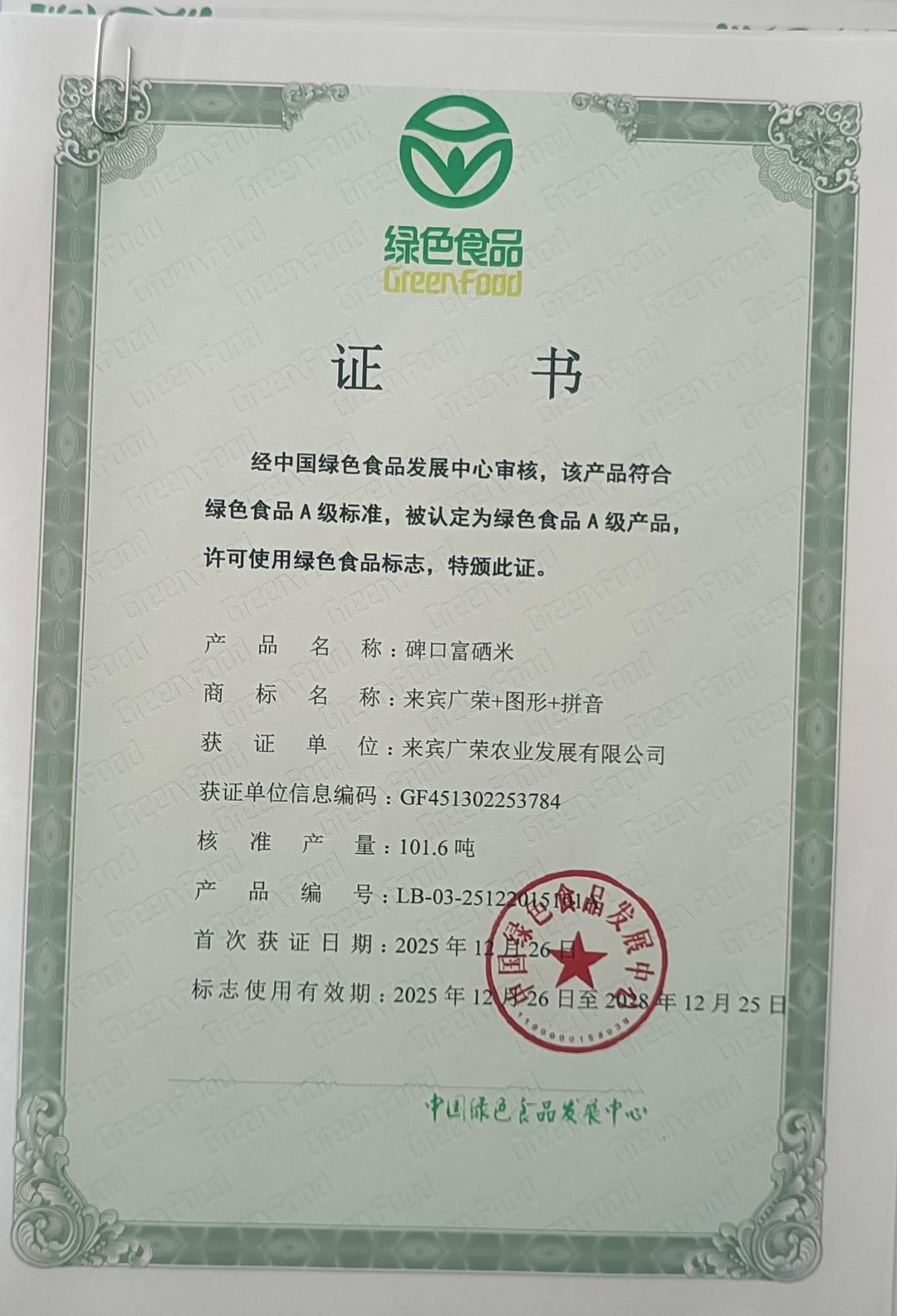 广西来宾广荣农业发展有限公司富硒农产品认定证书 黎 坚 摄影