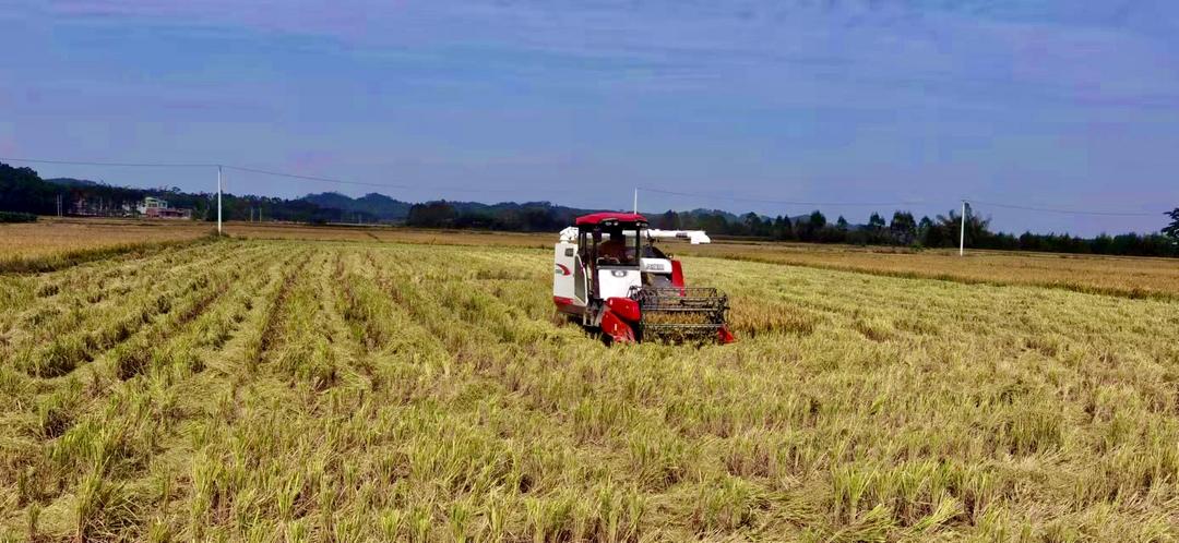广西来宾广荣农业发展有限公司员工正在用机械收割稻谷