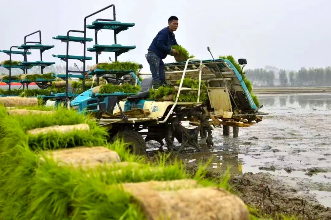 广西来宾广荣农业发展有限公司员工正在用机械插秧中