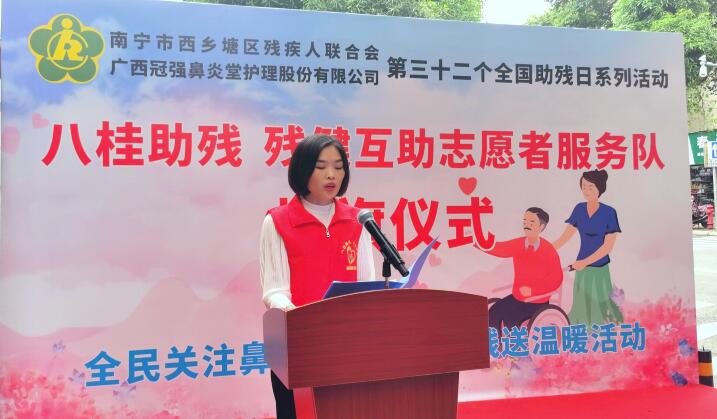 在第三十二次全国助残日,来临之际,为更好和更大范围开展扶残助残活动。5月15日,广西冠强鼻炎堂护理股份有限公司联合南宁医博中医肛肠医院、广西医大晶亮眼科医院、广西无障爱科技有限责任公司等爱心企业,共同举办了“八桂助残,残健互助志愿者服务队”的授旗仪式暨助残活动启动仪式,在南宁市天桃路举行。