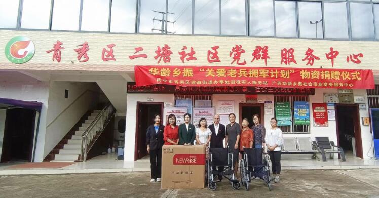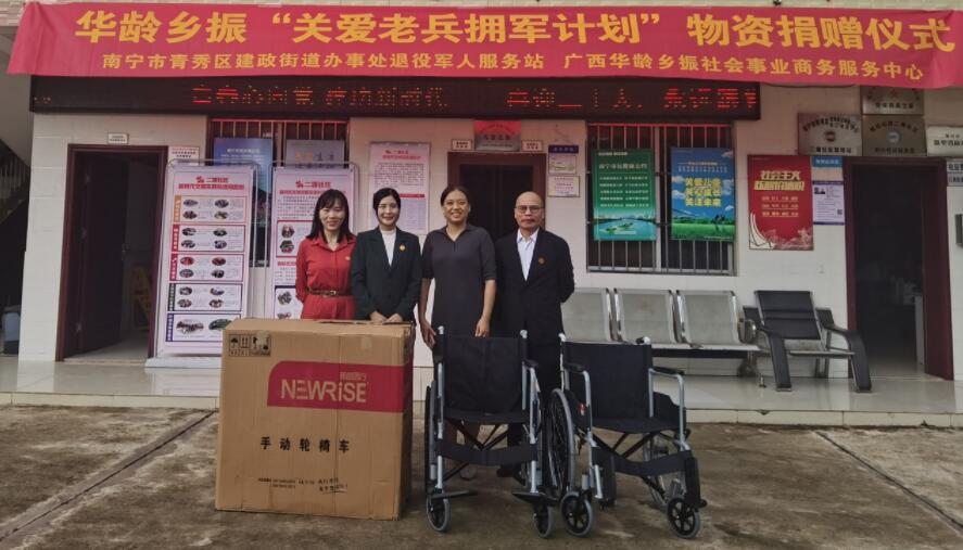 8月26日,广西华龄乡振社会事业商务服务中心联合南宁市青秀区建政街道办事处退役军人服务站开展“关爱老兵拥军计划”物资捐赠活动。南宁市青秀区建政街道办事处退役军人服务站负责人周女士,广西华龄乡振社会事业商务服务中心林丹妮主任、马善娥副主任以及董事会主席廖正杰出席本次捐赠仪式。