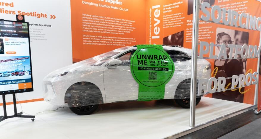 展台上,一款紧紧被包裹着的东风柳汽汽车,贴着“Unwarp me in the right way (请用正确的方式打开我) !” 此举寓意破茧成蝶,东风柳汽的新能源车,借助阿里国际站全链路数字化外贸能力,蝶变成有实力亮剑汽车大本营欧洲市场的生力军。