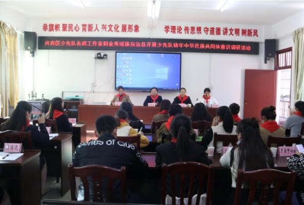 兴宾区少先队名师工作室潘靖琳、蒙艳银、黄凌艳三位名师先后展示了少先队活动课前说课、课后说课、红领巾奖章的经验做法等。县教体系统少先队工作者与兴宾区少先队名师工作室交流了黄泥鼓舞、舞香龙、茶道、瑶歌、瑶舞、瑶绣、千人腰鼓等特色校园文化。