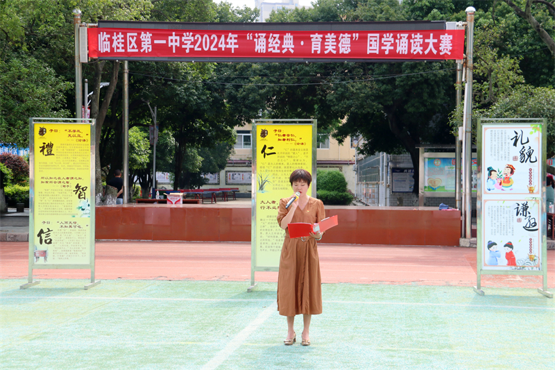 临桂一中副校长李丽霞致辞。她在致辞中强调,本次比赛旨在通过诵读、理解国学作品,让同学们更加深入地领略中华文化的博大精深,感受传统美德的力量。同时,李丽霞副校长还对同学们提出殷切期望,希望同学们能以此次活动为契机,认真阅读经典,并将古人的教育智慧和人生经验内化于心、外化于行,努力成为一名有理想、有道德、有文化、有纪律的社会主义建设者和接班人。