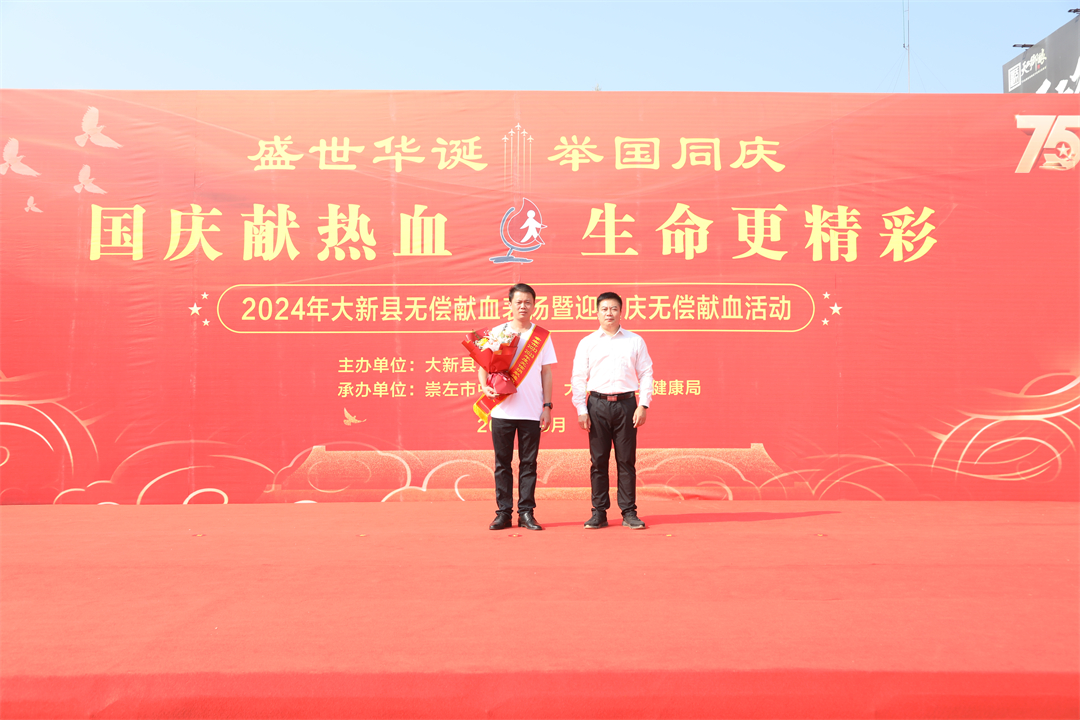 2023年大新县加强组织动员,全县共2100多人次参加了无偿献血,献血量达69.18万毫升,为危急重症患者临床救治用血提供了有效保障。去年全县共有94名无偿献血爱心人士获得崇左市通报表扬,其中无偿献血先进个人87人、促进个人6人及捐献造血干细胞先进个人1人。活动中对先进个人、促进个人及捐献造血干细胞先进个人代表进行表扬和授绶带。