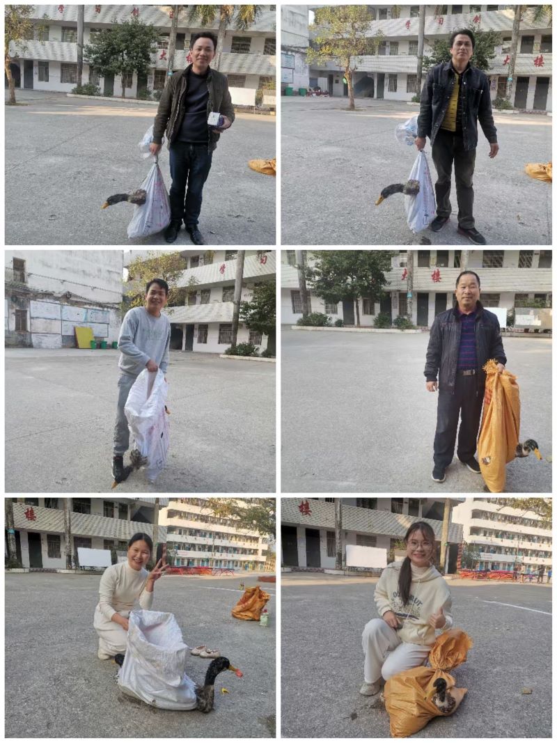 在套鸭子活动中,由全体教职员工抽签按序号进行。轮到上场者,每人发放5个圈,站在2米外投掷圈圈,套中指定物品,即可获得相应的奖品。物品除鸭子外,还有饮料、调料、零食、日用品等。