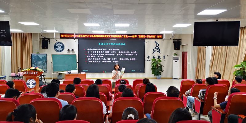 本次培训,是南宁职业技术大学服务崇左市大新县国家通用语言文字高质量推广普及和铸牢中华民族共同体意识教育工作内容之一。由自治区教育厅统筹协调,邀请广西幼儿师范高等专科学校初等教育学院副教授、国家级普通话水平测试员隋雯现场授课。课堂上,隋雯老师结合教师职业特点,围绕普通话声、韵、调的精准发音技巧、音节标准读音规范、语流音变规律,以及普通话水平测试应试重难点等核心内容展开,通过理论讲解、案例示范、实时纠音等方式进行针对性指导。参训教师全程专注投入,认真记录重点要点,主动参与发音练习、对话交流等互动环节,课堂氛围活跃,学习热情高涨。