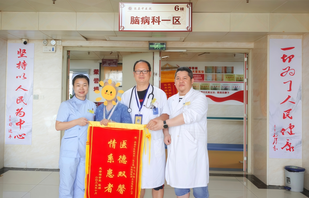 全体医护人员24小时密切监测患者生命体征,并耐心指导早期康复训练。经过数日精心治疗,患者意识逐渐清晰、肢体功能明显恢复。感动于医生们的专业与坚守,患者家属特意在国庆节送来写有“医德双馨,情系患者”的锦旗,对节日里依然坚守岗位、救死扶伤的医生表达最诚挚的敬意。