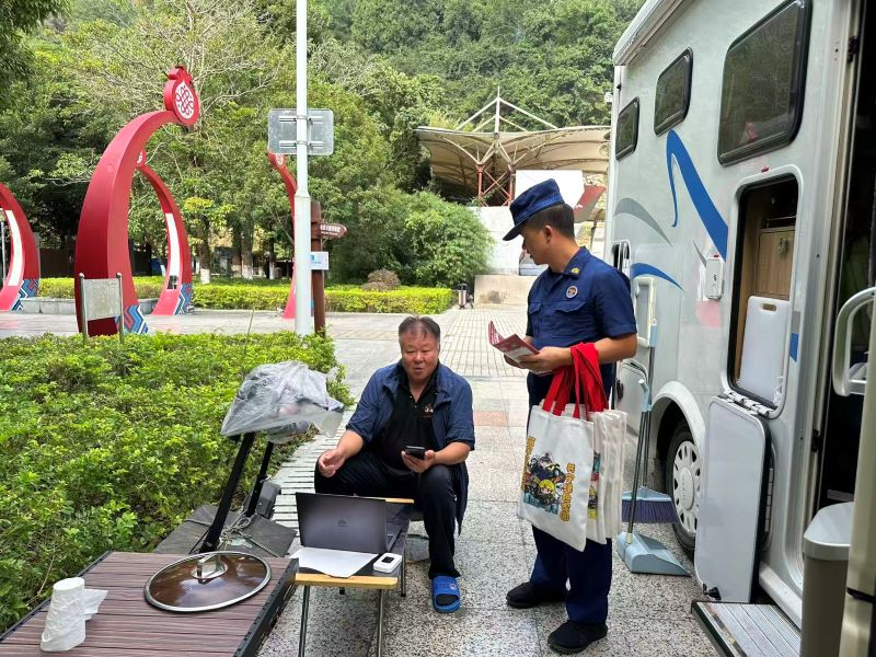 活动中,大队宣传员通过发放消防安全手册、张贴宣传海报、现场讲解等方式,向游客普及消防常识,重点提醒游客注意景区禁烟区域、安全用火用电、熟悉逃生路线等。宣传人员还针对房车停靠时的消防安全规范进行提醒,如远离杂草灌木丛、不私拉乱接电线充电等。同时,针对景区周边民宿、餐饮场所的从业人员,宣传员结合典型案例,详细讲解了初期火灾扑救、消防器材使用及应急疏散方法,并针对游客提出的消防安全问题,进行了耐心细致的解答。