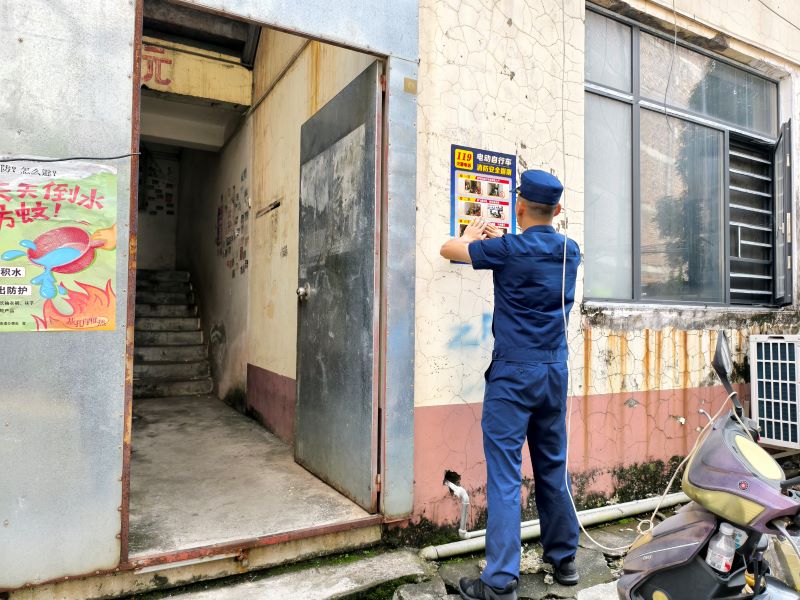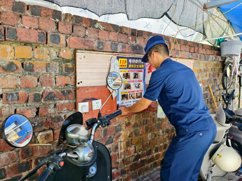 期间,大队宣传人员联合社区网格员、小区物业深入居民社区、自建房等场所,将电动自行车安全提示海报张贴在各场所公示栏、楼梯出口、电动车室外停放点等醒目位置,让广大群众出入时都可以看到提示海报,使其在潜移默化中认识到电动自行车上楼入户、乱停乱放的危险性。在张贴宣传海报的同时,宣传人员还向各小区物业及过往群众耐心细致讲解消防安全知识,发放消防安全知识手册,叮嘱场所负责人加强管理,做好居民提示宣传工作,提醒群众不要将电动车停放在门厅、楼道内,不要占用消防车通道,不要将电动自行车驶入电梯、上楼入户,避免火灾事故的发生。