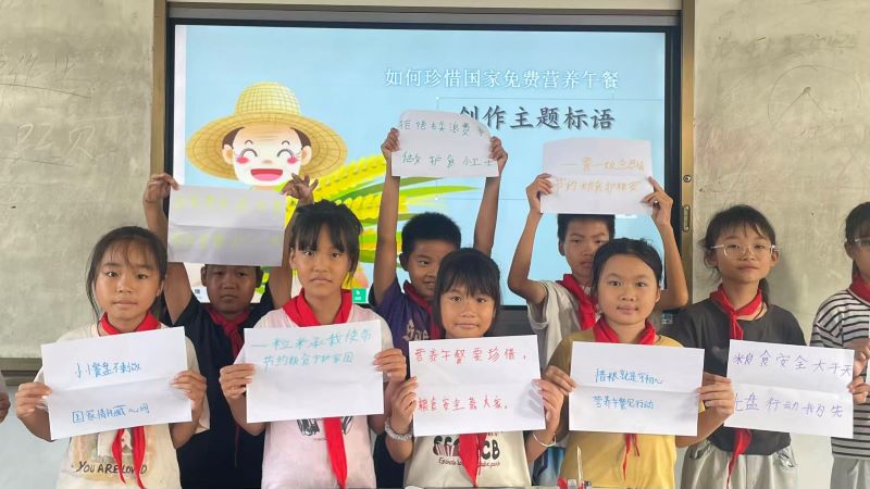 为让理念进一步落地,班会还设计 “如何珍惜国家免费营养午餐” 标语创作环节。同学们积极参与,涌现出 “致敬袁隆平院士,每粒米饭皆珍贵”“小小餐盘不剩饭,国家情怀藏心间”和“营养午餐要珍惜,粮食安全靠大家” 等兼具童趣与深意的作品,用文字传递珍惜粮食、守护营养午餐的真挚心声。