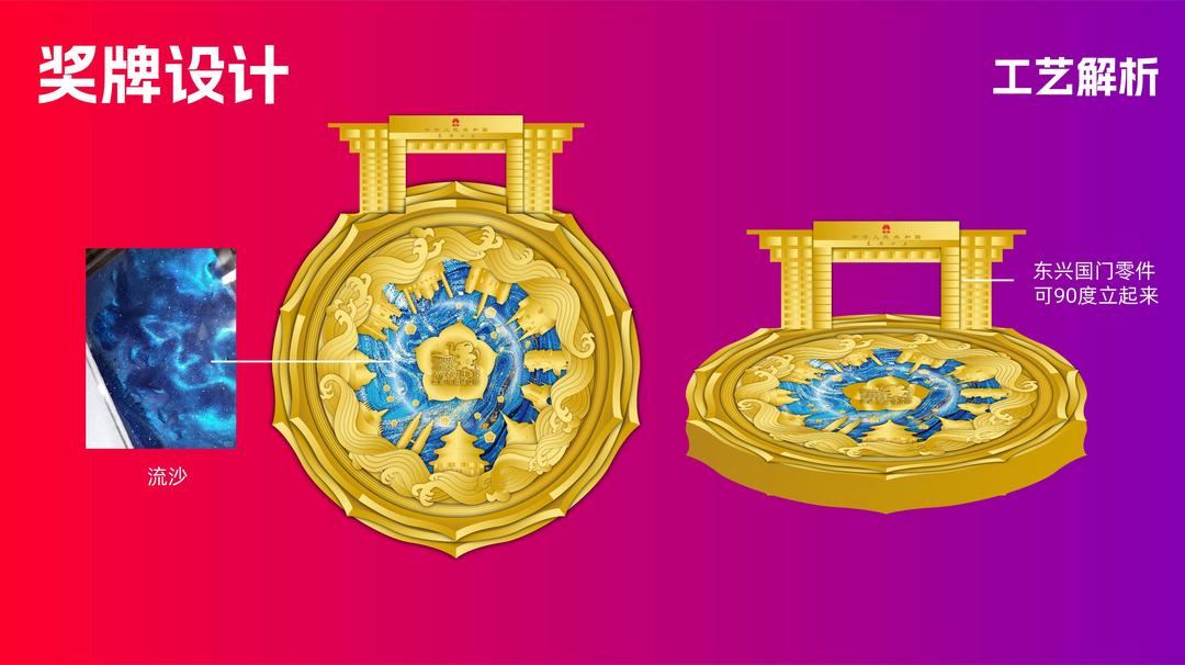在形象设计方面,本届赛事视觉以红色为主色调,体现热烈大方,融合防城港城市标识与东盟多元文化,展现“山海相连、口岸通达”的城市意象。赛事奖牌正面以绽放金花为型,中心圆形区域以海浪为灵感,外圈环刻东盟十国代表性建筑,展现多样与包容;奖牌顶部创新设计为“东兴国门”折叠支架,可90度垂直立于桌面,兼具荣誉象征与艺术陈列功能;背面融入防城港本地文化符号与山海意象,承载跑者独特记忆。