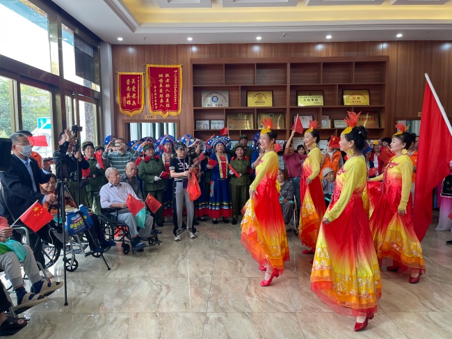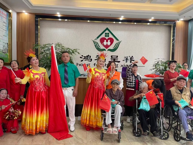当熟悉的旋律回荡在养老中心上空,许多老人情不自禁地随着音乐轻轻哼唱,眼神中闪烁着欣喜的光芒。此刻,养老中心的活动大厅内座无虚席,养老院的老人们沉浸在欢乐的海洋中。当艺术团的演员们深情的表演歌伴舞《我和我的祖国》时,现场的不少老人随着熟悉的旋律轻和节拍,手里摇着五星红旗,和全体演员一同合唱起来,大家在歌声中感受到了人们对祖国的无尽热爱和感激之情。