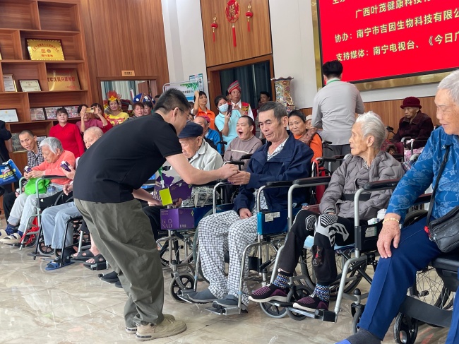 除了精彩的文艺演出与专业的健康指导,爱心企业代表们还为养老中心的长辈们送上了精心准备的慰问品,浓浓的关怀之情也浸润着养老中心的每个角落。广西叶茂健康科技有限责任公司的业务经理华子代表公司给鸿福呈祥养老服务中心的长辈们赠送每人一瓶时光露细胞营养液。祝老人们身体健康!福如东海!同时,华子经理还将时光露细胞营养液赠送给养老院的院长和院领导们。感谢谢他们为老人提供的周祥服务。紧接着,广西辉耀之星演艺中心的爱心演员们给养老院的老人送上暖心的冬袜和刚从农场采摘回来新鲜香蕉,祝愿老人们的这个冬天拥有开心的健康和无尽的暖意!