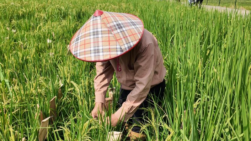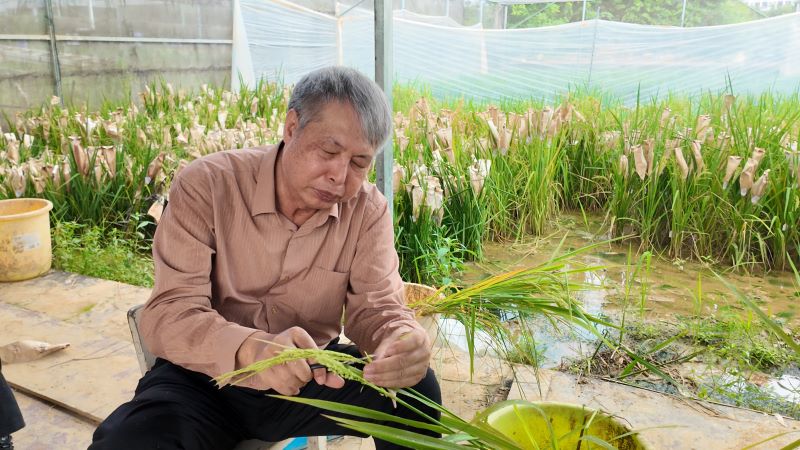 李容柏教授在广西大学农学院的试验田里进行水稻杂交前的准备工作以及查看水稻生长情况