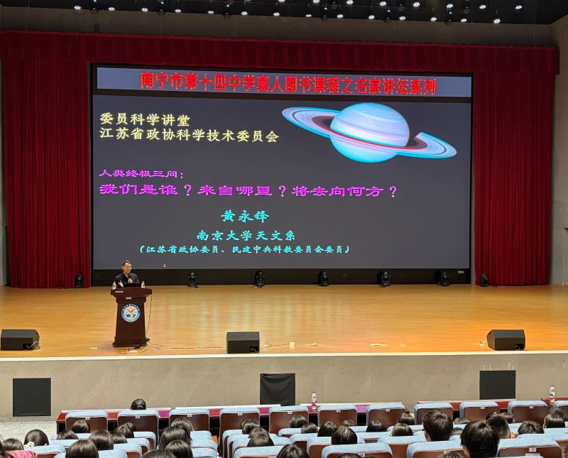 今日广西南宁讯 为深入践行学校“唤醒生命,守望成长”的办学理念,培养具有“君子品质,家国情怀”及科学思维的学子,2025年10月31日晚,南宁市第十四中学教育集团高中部“名家讲坛”开讲,邀请南京大学天文与空间科学学院黄永锋教授,带来题为《人类终极三问:我们是谁?来自哪里?将去向何方?》的天文科学讲座。