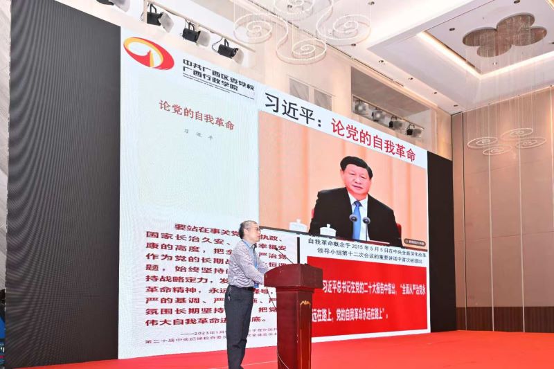 根据大会议安排,国务院特殊津贴专家、广西党史特聘专家、中国特色社会主义理论研究会理事、广西国史学会副会长、中共广西壮族自治区委员会党校马基地办主任何成学研究员作了题为:“从百余年党史诠释党的社会革命与自我革命”的主题学术演讲。何成学研究员在学术演讲中指出,习近平总书记在新时代提出并反复强调“革命”“社会革命”和“自我革命”问题。如果将其放到百余年党史的坐标中,就更能展示出习近平关于“社会革命”和“自我革命”重要论述的历史厚度、理论深度和时代高度,为提升新时代斗争本领提供基本遵循和丰富的营养剂。何成学研究员在学术演讲中还从党的优良传统、党的自我革命时代内涵要求、新思路新办法新举措等三个维度进行了系统深入阐述。