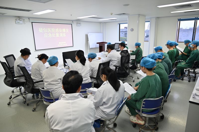 演练由该院院长黄志汉担任总指挥,分管院感的副院长赵峰任副总指挥,医务科、护理部、感控科、检验科、药剂科、后勤管理部等10余个科室参与。赵峰宣布演练启动后,现场以“ICU连续出现3例CRKP肺部感染疑似病例”为背景,展开全流程推演。推演内容涵盖事件报告、初步核实、预案启动、流行病学调查、感染源追踪、防控措施部署、效果评估及总结反馈等八大环节,重点检验了应急响应速度、多部门协作效率及防控措施的科学性。