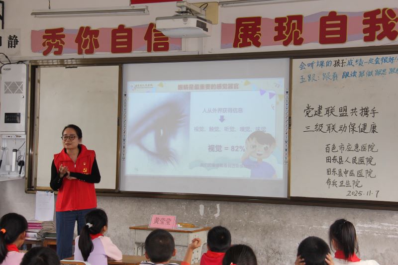 与此同时,田东县人民医院的医护人员则在另一班级开展近视防控宣讲,重点解读 “三个一” 读写姿势规范,结合学生日常作息,补充了合理使用电子产品、定时远眺放松、认真做眼保健操等实用护眼技巧,帮助同学们筑牢视力防护屏障。