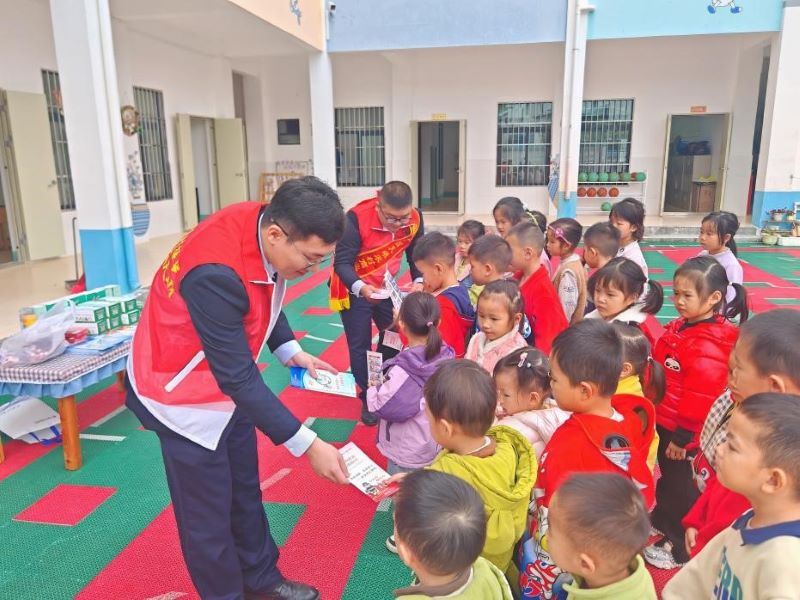 图为广西天峨农村商业银行组织工作人员走进下老乡中心幼儿园,开展了一场消防宣传咨询活动