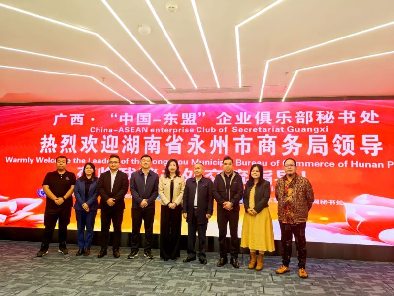 永州市商务局局长周晓芬介绍,经湖南省人民政府批准,由湖南省商务厅和永州市人民政府主办的“2025东盟·湖南(永州)名优产品交易会”将于2025年11月29日-12月1日在永州市举办,同期将举办“湖南-东盟投资贸易洽谈会”为加深湖南省、永州市与广西和东盟国家经贸合作交流,这次我们前来拜访交流,诚挚邀请贵秘书处领导出席交易会和投洽会等相关活动。广西是中国-东盟的桥头堡,永州也是湖南-东盟的桥头堡,永州市的优质农产品大量供港、占比非常高,希望我们双方以后在各方面加强合作,共同为两地经济社会发展做贡献。随后周晓芬局长还简单介绍了永州市的足球湘超等项目的发展情况。