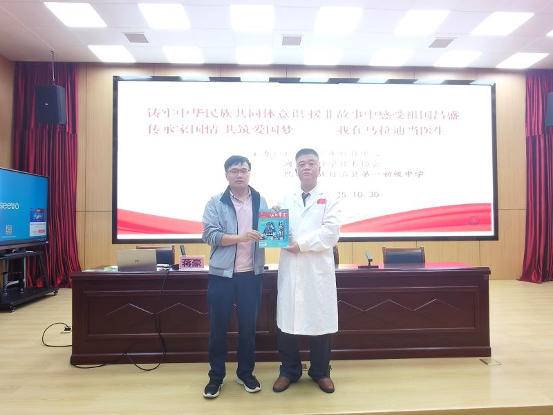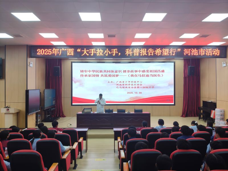 今日广西河池讯 为了深入贯彻落实《中华人民共和国科学技术普及法》、《全国科学素质行动规划刚要(2021年—2035年)》和《中共中央国务院关于进一步加强和改进未成年人思想道德建设的若干意见》,提高未成年人的科学素养。由广西青少年科技中心联合河池市科学技术协会、巴马瑶族自治县科学技术协会共同主办的2025年快乐科普校园行活动,于2025年10月30日下午在巴马瑶族自治县巴马镇初级中学开展了以“铸牢中华民族共同体意识,援非故事中感受祖国昌盛;传承家国情,共筑爱国梦《我在马拉迪当医生》”为主题的讲座。本次活动特邀曾参与中国援非医疗工作的广西未成年人科普演讲团专家、广西医科大学第五临床医学院蒋豪教授担任主讲人。