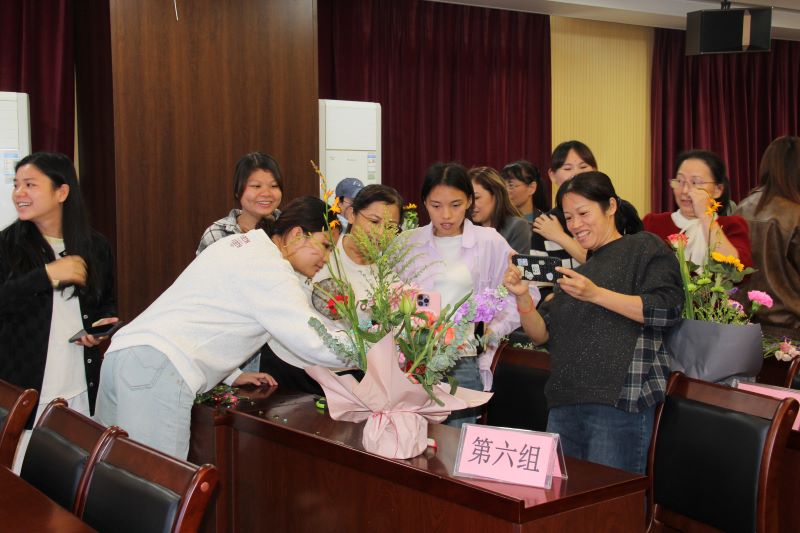 实操环节结束后,各小组进行作品展示,杨老师针对每组作品逐一开展专业点评,并评选出 “最美花束”“最佳创意作品” 等奖项。