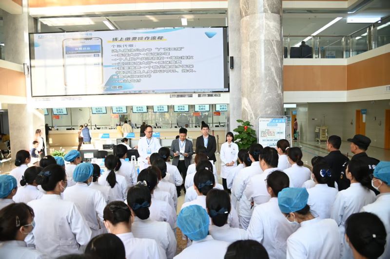 演练模拟患者张先生(模型人)在门诊收费窗口排队时突然瘫软倒地,家属发现异常后惊慌呼救,正在附近引导患者的导诊护士迅速上前评估,确认患者无意识、无呼吸后,立即给予胸外心脏按压,启动院内急救应急预案。