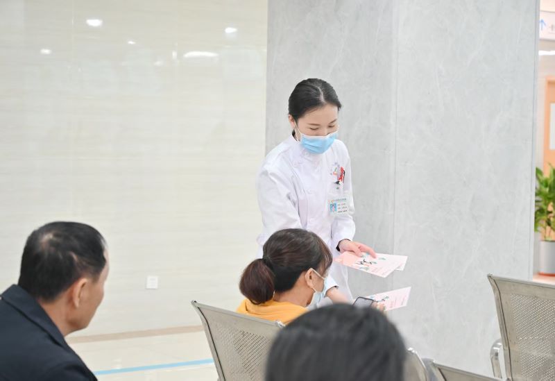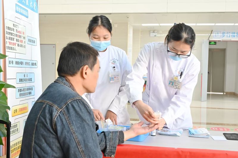 活动现场,内一科医生创新推出“服务前移”举措,来院就诊的患者无需挂号就可享受到免费的医疗服务,对于需要开胰岛素等慢病用药的病人随即直接接诊开方,省去了患者排队等候、来回奔波的麻烦,让便民服务真正落到实处。内一科护士则耐心免费为群众测量血压、血糖,让他们及时了解自身血压、血糖状况,发现异常可尽早干预,便民服务暖人心!同时,门诊部护士一边免费发放糖尿病健康宣教卡,一边用通俗的语言拆解卡片上的核心知识点,尤其针对职场人群久坐、饮食不规律等常见问题,重点科普防控要点,让大家了解更多糖尿病防治常识,同时全程引导患者有序就诊。
