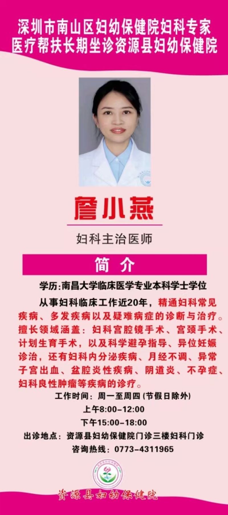 如果您或身边亲友正被宫颈息肉、内分泌失调、异常子宫出血、绝经后出血等妇科问题困扰,无需再远赴大城市排队!依托粤桂医疗协作的暖心助力,三甲医院专家詹小燕医师长期在资源县妇幼保健院坐诊,用专业的诊疗技术、贴心的医疗服务,为您的健康保驾护航。