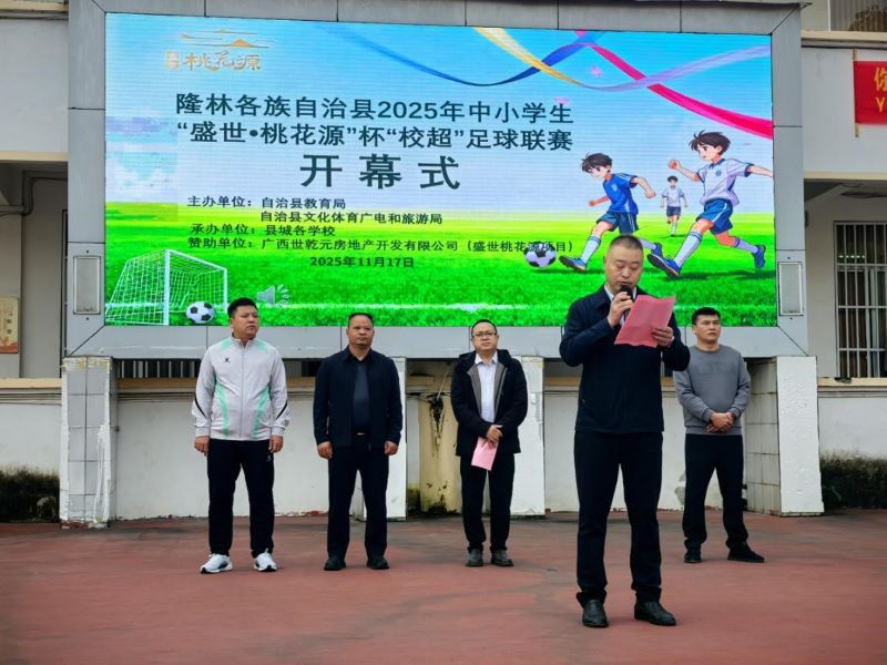 今日广西百色讯 11月17日早上,隆林各族自治县2025年中小学生“盛世·桃花源”杯校园足球联赛正式拉开帷幕。自治县教育局领导班子、文化体育广电和旅游局分管领导、广西盛世乾元房地产开发有限公司有关嘉宾、全体裁判员、参赛师生齐聚绿茵场,共同见证这场充满青春活力与民族团结情谊的体育盛会。