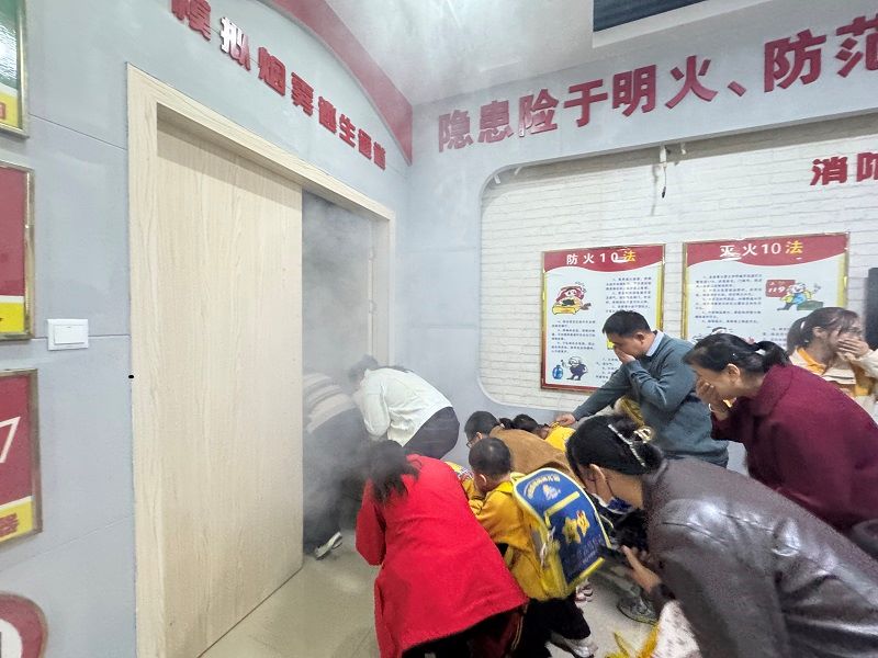 活动开始,消防宣讲员化身“安全老师”,带领亲子家庭走进消防教育馆。馆内陈列的消防器材模型、火灾案例图片,迅速吸引孩子们的注意力。结合儿童认知特点,宣讲员通过播放动画短片、剖析典型火灾案例、开展互动提问等形式,系统讲解“如何正确拨打119火警电话”“常见消防标志识别”“基础消防器材用途”及“火灾逃生要点”等知识。随后,现场开展模拟烟雾逃生演练:淡蓝色模拟烟雾中,家长们紧紧牵住孩子的手,遵循宣讲员指引弯腰低姿前行,快速完成逃生体验,将理论知识转化为实践技能。