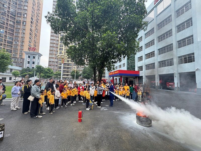 活动最后,油盆灭火体验环节将氛围推向高潮。消防员现场演示灭火器“提、拔、握、压”使用口诀,强调操作要点与安全注意事项。在专业防护保障下,家长与孩子两两配合,轮流参与实操:家长紧握灭火器手柄,孩子在旁辅助,按照“对准火苗根部喷射”的指引,共同将油盆中的火焰扑灭,亲身感受灭火过程。