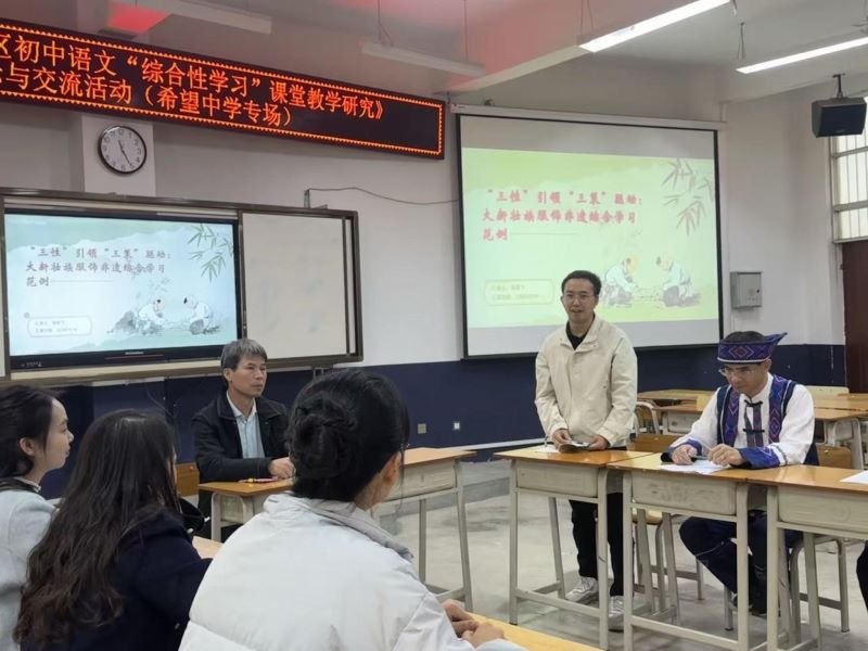 本次活动核心环节为农科锋老师执教的九年级示范课《探寻身边的“非遗”——大新壮族民族服饰探微》。该课以本土非物质文化遗产“壮族民族服饰”为切入点,巧妙融合语文教学与乡土文化,充分体现了“综合性学习”的课程理念。