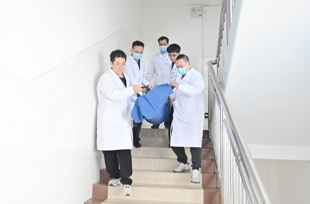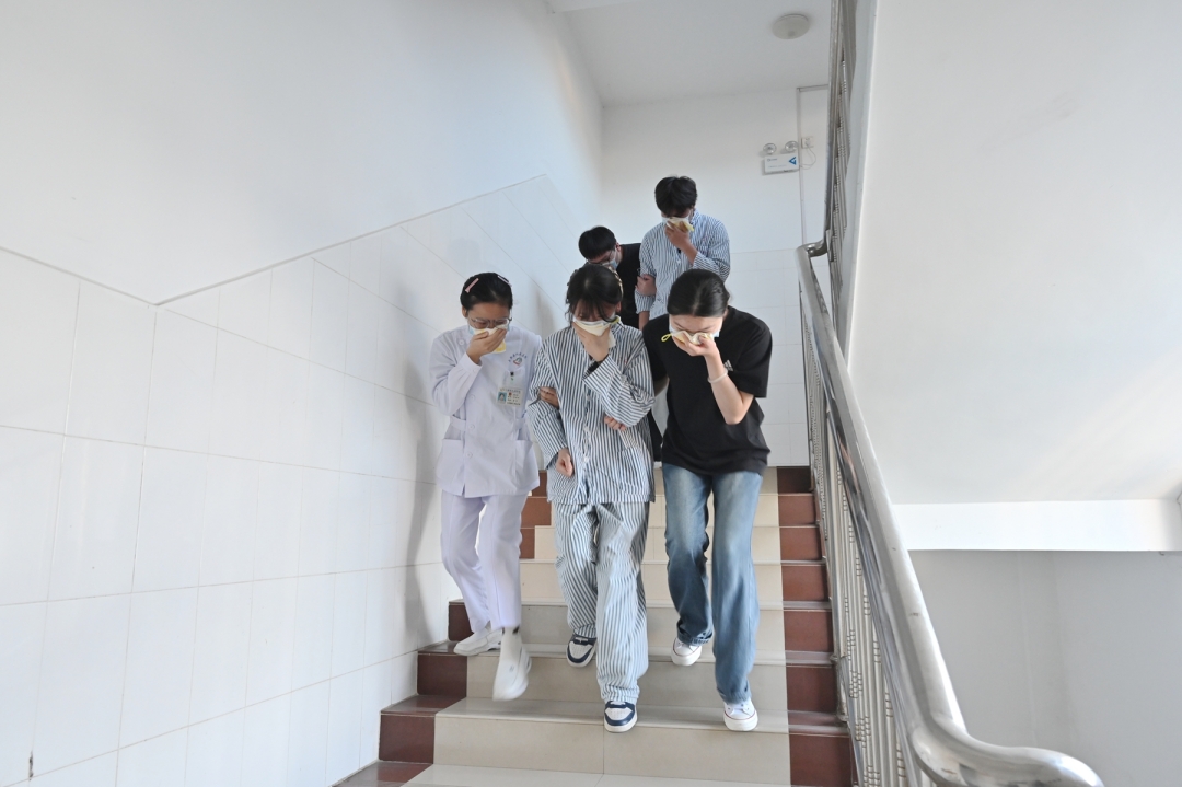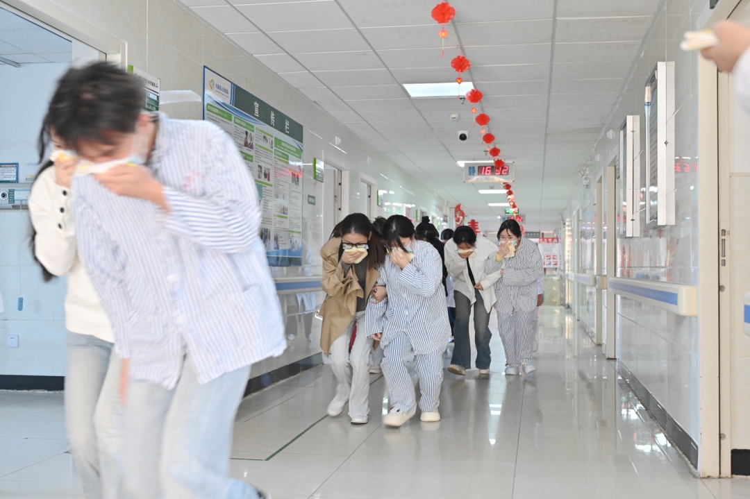 随着指挥部指令下达,各应急小组迅速响应、协同作战。转运疏散工作正式启动,对于轻症患者及陪同人员,由医护人员引导其用湿毛巾捂住口鼻,弯腰低姿沿安全通道有序撤离,全程明确禁止乘坐电梯。而对于行动不便的患者,则安排医护人员使用担架转移到安全地带。同时,消控室人员携带灭火器材火速抵达“火场”,快速完成水带连接、器材调试等操作,针对模拟火点展开初期扑救,成功控制“火势”蔓延。