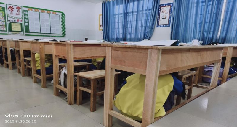 演练模拟了地震与火灾两种常见突发情境。随着警报声响起,各班学生在任课教师和班主任的指挥下,迅速采取防护措施:地震演练中,学生用书本护头躲于桌下;火灾演练中,学生用湿布或红领巾捂住口鼻,弯腰沿指定路线迅速撤离。整个过程组织严密、行动迅速,未发生任何拥挤、推搡现象。