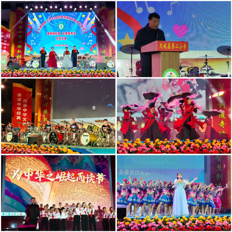 今日广西河池讯 11月28日晚,天峨县第二小学2025年校园文化体育艺术——文艺晚会汇演在学校舞台精彩上演。整场晚会以“清风润校园,艺体绽芳华”为主题,将前期才艺、舞蹈、诵读板块的精彩内容进行了集中呈现。