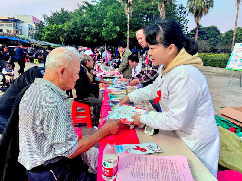 12月1日,大新县31家防治艾滋病工作委员会成员单位联合在德天广场,通过设防艾健康咨询服务台、摆放宣传展板、免费进行艾滋病抗体筛查、免费发放安全套、开展健康义诊等形式,向群众讲解艾滋病的传播途径、预防策略以及“暴露后预防”等健康知识,并普及“早检测、早发现、早治疗”理念,引导有高危行为者及时检测与规范就医。