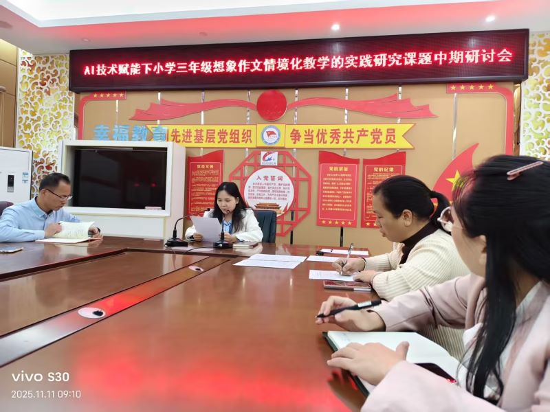 今日广西梧州讯 为系统总结阶段性研究成果、破解实践难题,推动AI技术与小学作文教学深度融合,2025年11月11日上午9点,《AI技术赋能下小学三年级想象作文情境化教学的实践研究》课题中期研讨会如期举行。课题组成员齐聚一堂,围绕AI赋能作文教学的实践探索展开深入交流,校长黎敏出席并作指导性讲话。