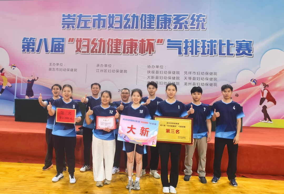 这份荣誉不仅是对队员们拼搏精神的肯定,更是大新县妇幼保健院团队凝聚力的生动体现。通过此次比赛,进一步激发大新县妇幼保健院职工的集体荣誉感和归属感,增强团队向心力,也促进与各兄弟单位的交流与友谊。大新县妇幼保健院将以此为新的起点,继续发扬团结协作、奋勇争先的精神,将赛场上的热情与斗志转化为推动妇幼健康事业发展的强大动力,为医院高质量发展和健康崇左建设贡献更大力量!(黄贵群)