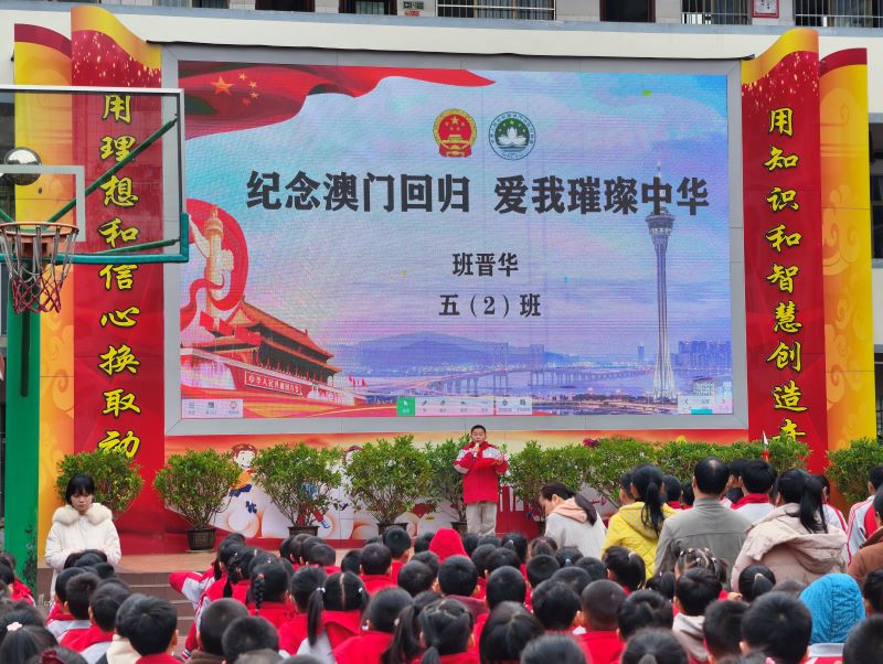 活动现场,五(2)班的班晋华同学站在舞台中央,面对全校师生进行主题演讲。大屏幕上五星红旗与澳门区旗交相辉映,天安门与澳门地标建筑的画面融为一体“用理想和信心换取动力,用知识和智慧创造未来”的标语格外醒目。台下的同学们身着红色校服,认真聆听,重温澳门回归的历史时刻感受祖国的繁荣与统一的意义。