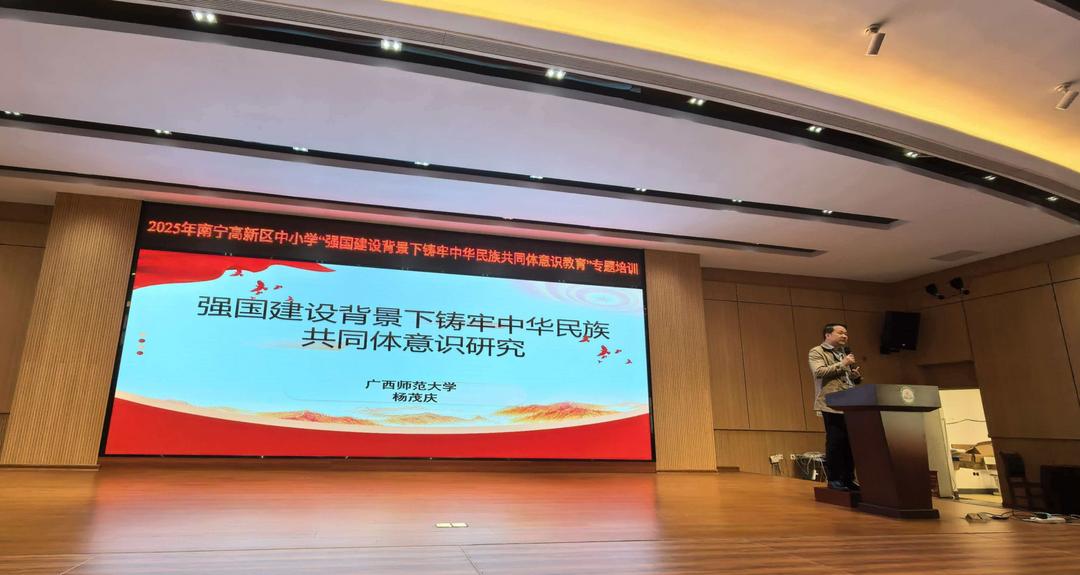 杨茂庆教授以“强国建设背景下铸牢中华民族共同体意识教育”为核心主题,首先为参会教师系统解读核心理论,阐释中华民族共同体的基本概念、核心要义与时代价值,梳理新中国民族政策发展沿革,并以立足广西民族团结进步示范区实践优势,结合“四个与共”、“五个共同”等理念,从理论渊源、历史脉络、现实挑战、实践路径多维度,剖析铸牢中华民族共同体意识对民族复兴、民族关系巩固及民族工作创新的重大意义;最后聚焦中小学教育实际,围绕共同体意识教育融入课堂教学、校园文化建设、社会实践活动等关键环节,提供兼具理论高度与实操性的指导建议,为参训教师搭建起从理论认知到实践落地的完整育人框架。