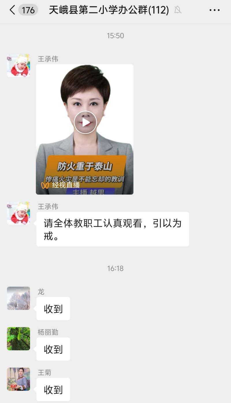今日广西河池讯 12月20日,天峨县第二小学通过办公群部署森林防火宣传学习工作。学校相关负责人王承伟在教职工办公群中发布森林防火警示教育视频,要求全体教职工认真观看、引以为戒,教职工们纷纷回复响应,展现出对森林防火工作的重视。